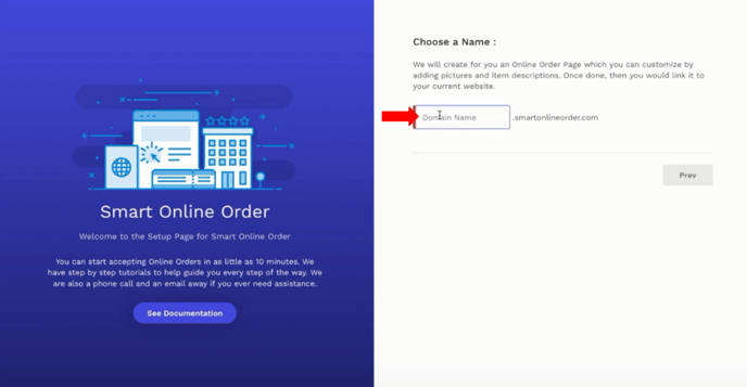 You will then be prompted to choose a domain name for your online order page. Ensure that the domain name is a single word without ".com" as the system will automatically append it. For instance, entering "brightsburgers" will have the system create the .com site all by itself.